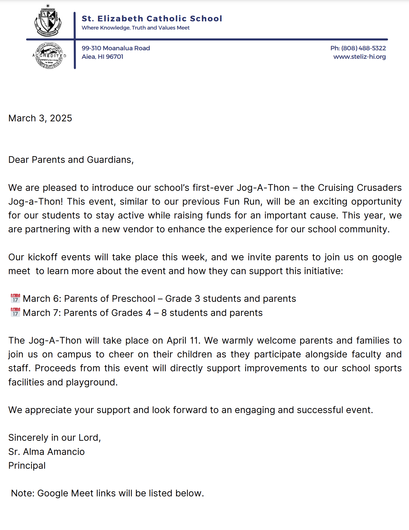 St. Elizabeth School 99-310 Moanalua Road Aiea, HI 96701